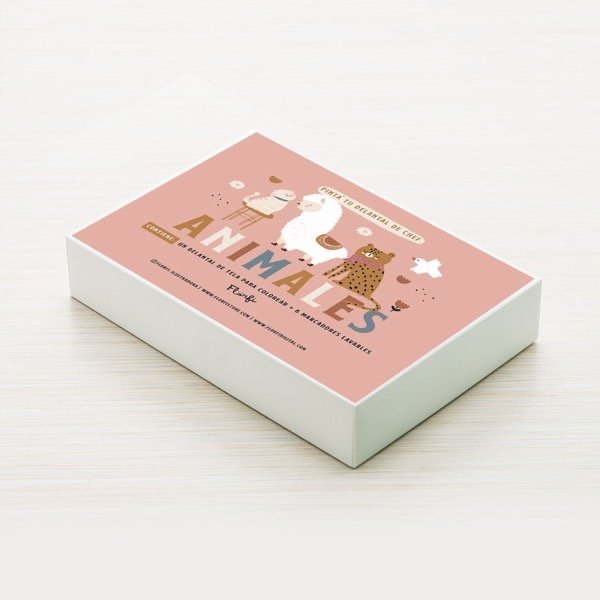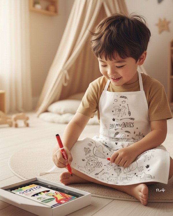 Incluye un delantal de tela con ilustraciones en blanco y negro para colorear y una caja de 6 marcadores lavables GIOTTO, ideales para que los peques den rienda suelta a su imaginación.